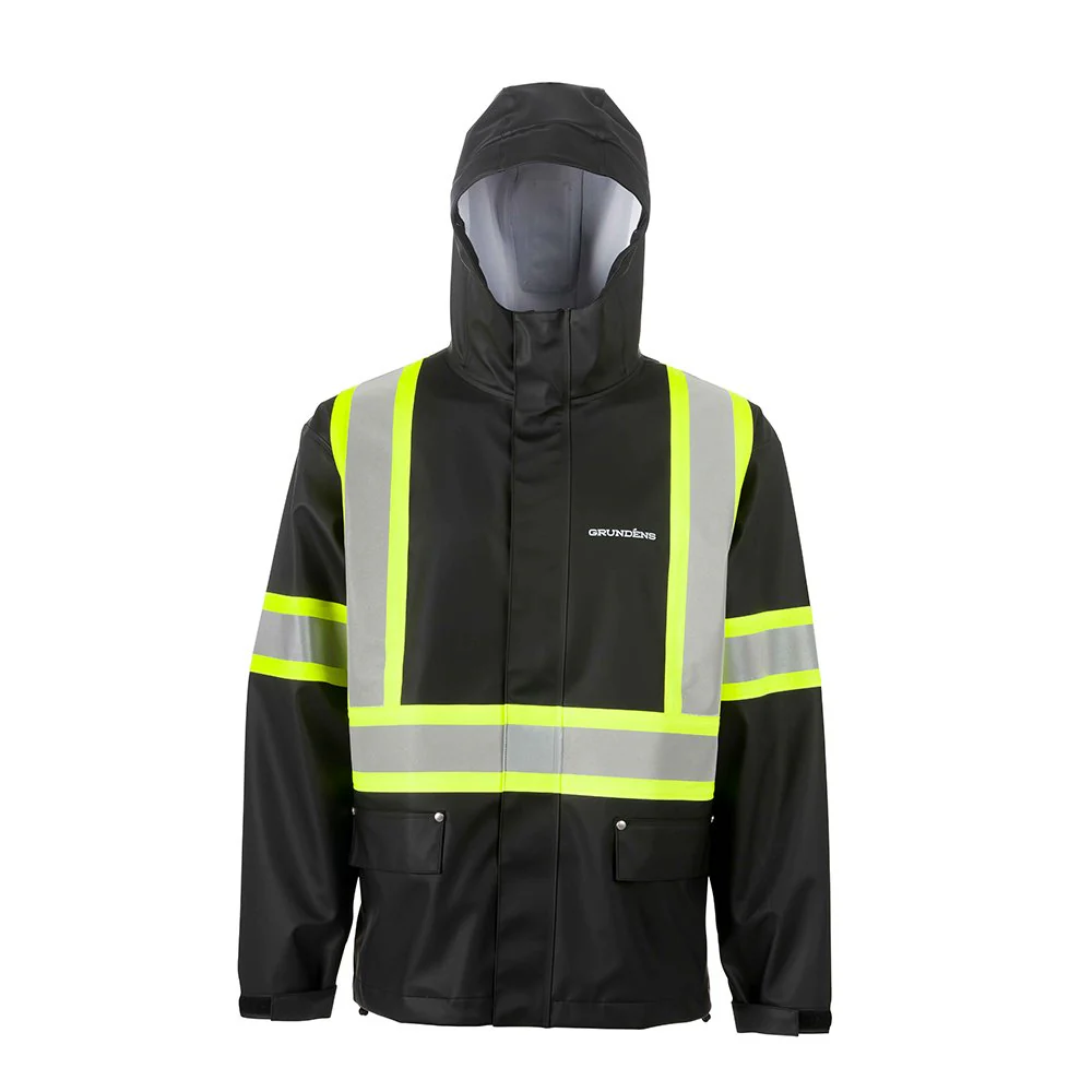 Full-zippered hooded jacket made from medium-weight polyurethane-coated polyester fabric for the waterproof protection, comfort and easy movement active fishermen need. An athletic cut and underarm gussets deliver protection without restricting fishing action.